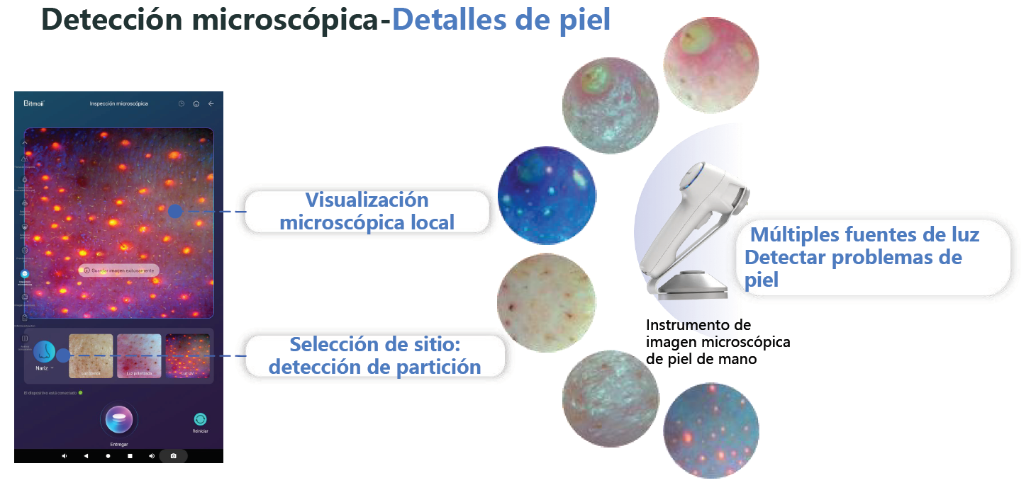 Detecta y documenta problemas como acné, manchas, arrugas, poros, sensibilidad, pigmentación profunda, envejecimiento, así como grasa capilar, obstrucción folicular y salud del cuero cabelludo, ideal para tratamientos faciales y capilares (láser, microneedling, mesoterapia, regeneración capilar y más).