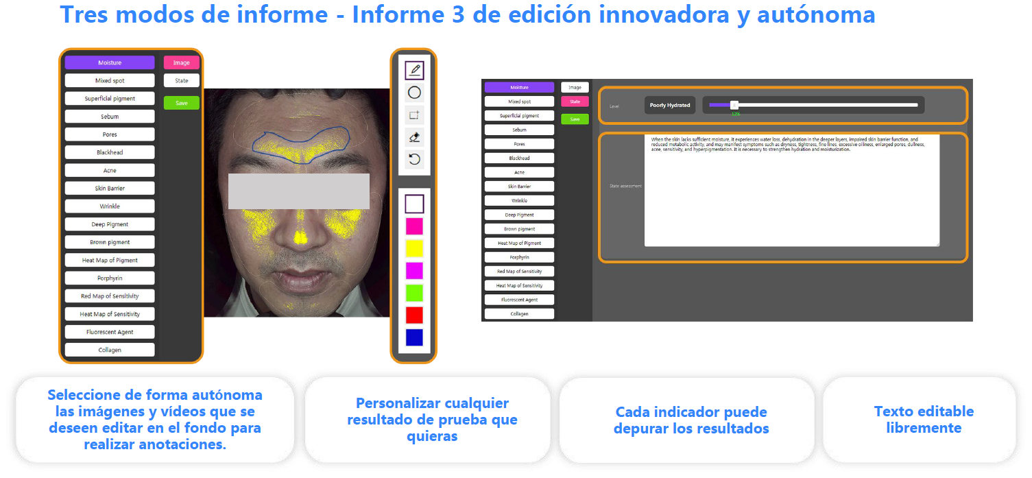 Genera informes automáticos, comparativos y personalizables, accesibles vía QR y almacenados en la nube, que aumentan la confianza del paciente y facilitan el cierre de tratamientos de alto valor. Además, permite predecir el envejecimiento de la piel, ayudando a vender planes preventivos a largo plazo.