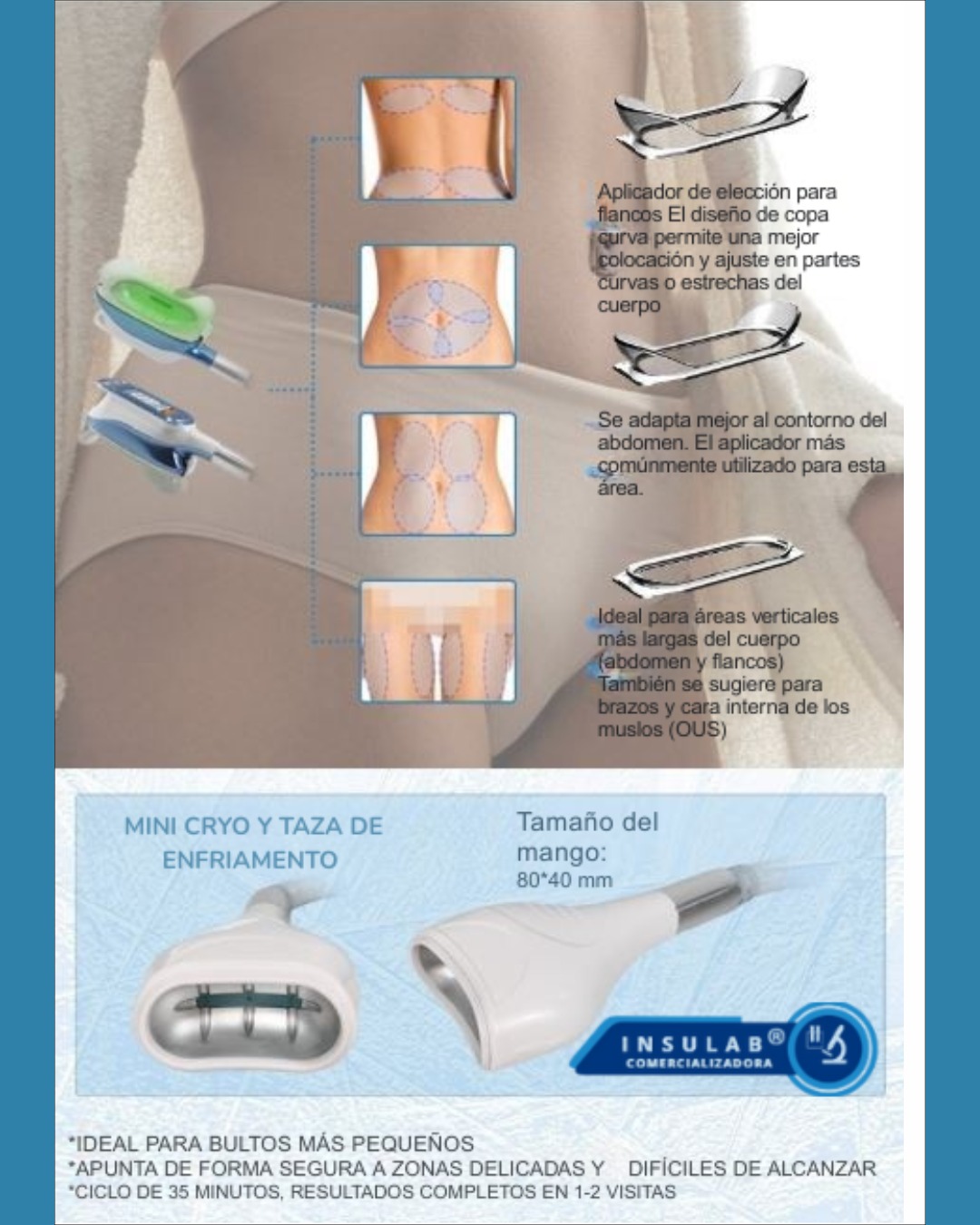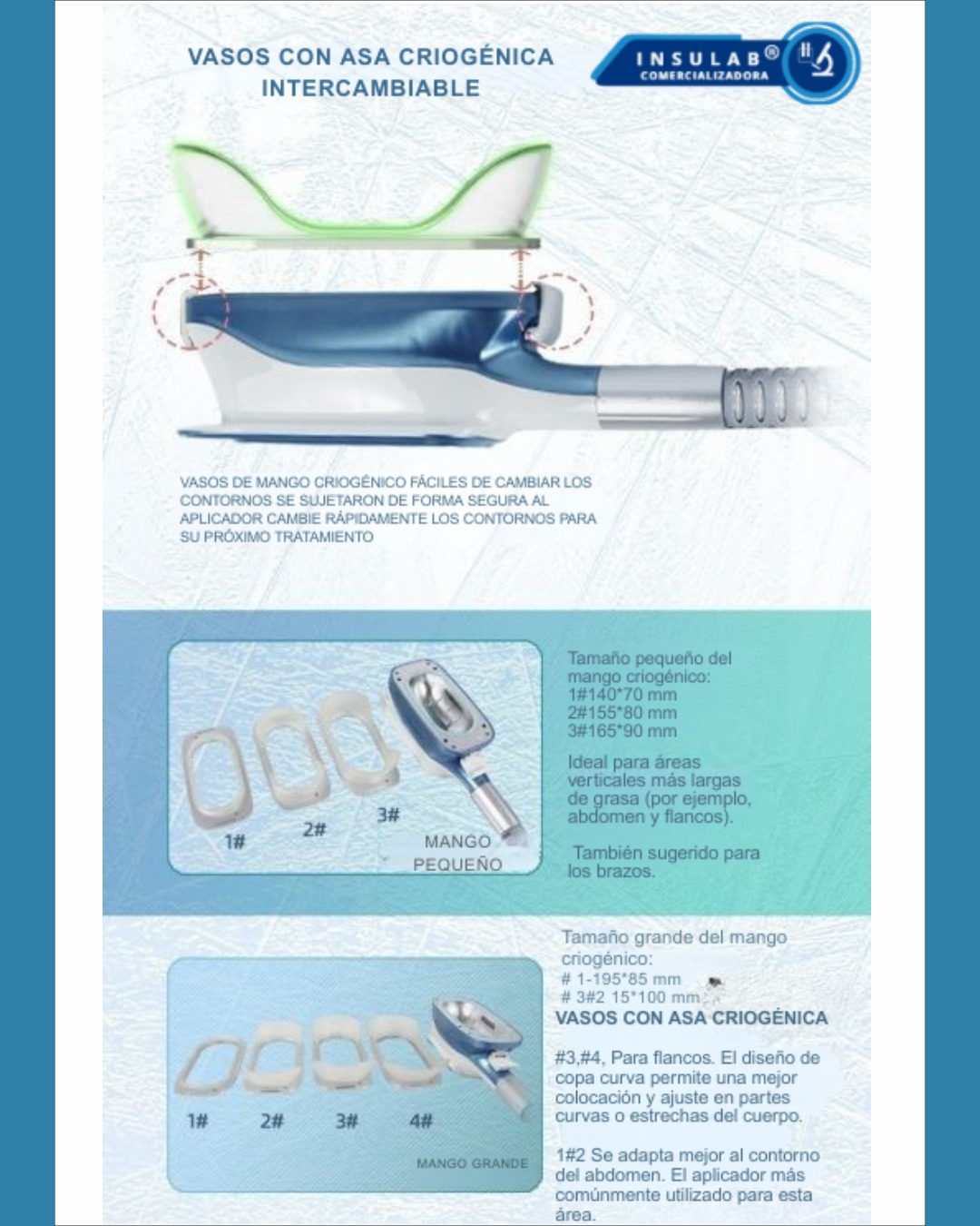 - 4 mangos criogénicos para áreas amplias (abdomen, muslos, flancos).
