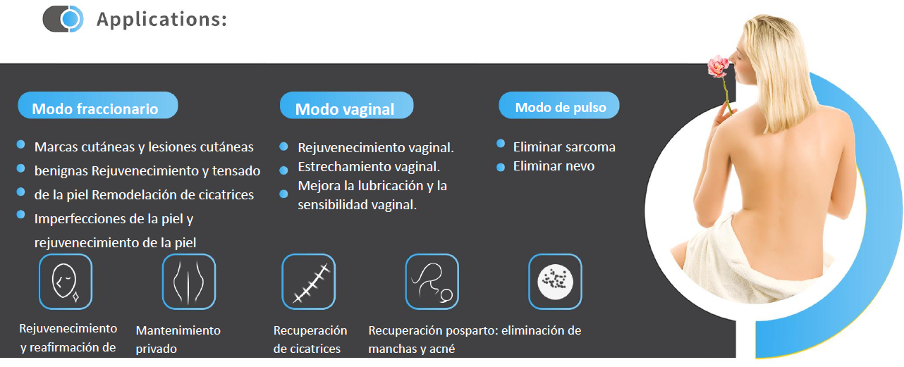 - Modo fraccional (estético), ideal para rejuvenecimiento y corrección de imperfecciones.