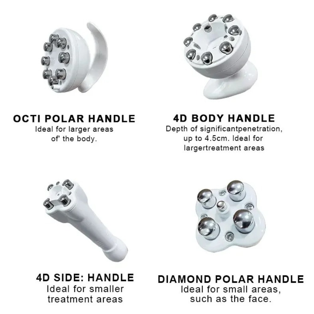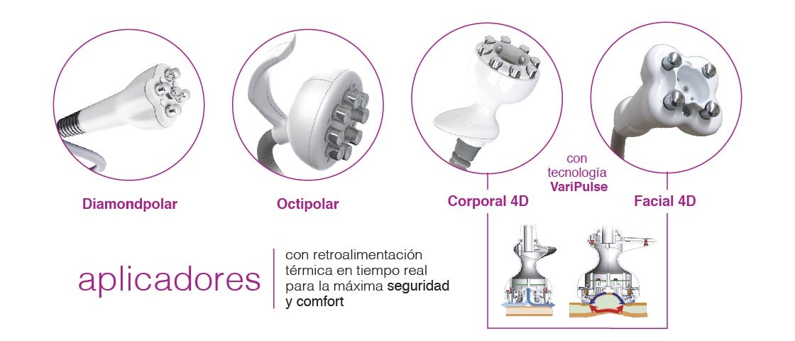 - Cuatro cabezales especializados: OctiPolar, 4D Facial, 4D Body y DiamondPolar, para tratar distintas zonas y necesidades.